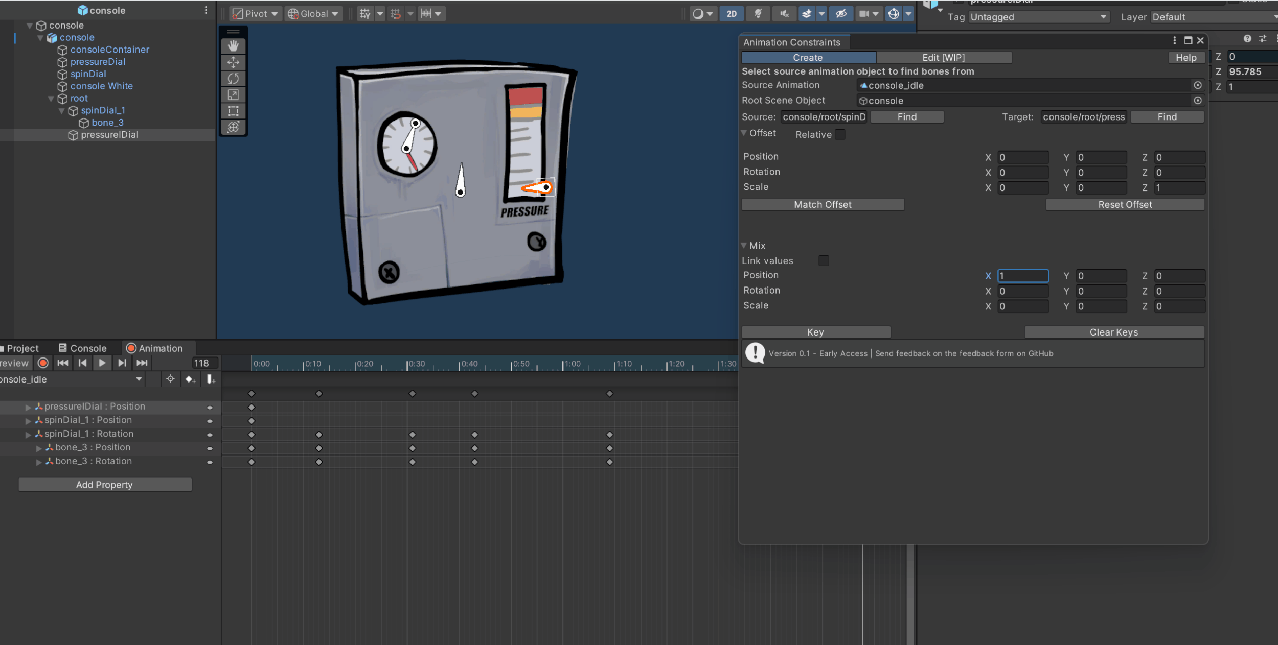Coming from other animation packages, certain movements are easier to animate via constraints. I wanted a tool that would let me fake parenting, and automate inverse rotations for fake 3d effects. When I started this project, I had no idea Unity had a constraints system — but I quickly found out that their system, while it worked in Editor, unlike mine, it was limited in how it would manipulate objects. If you want something to move half the amount, double the amount, or only affect certain channels you are out of luck and have to do that manually— which may be painfully difficult depending on what movement you are trying to copy keyframe by keyfram .